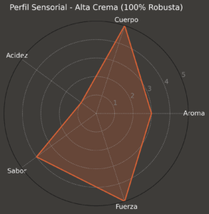 El café Alta Crema es la máxima expresión de intensidad en taza. Elaborado exclusivamente con granos 100% robusta, este café destaca por su carácter potente, su cuerpo contundente y una crema densa y persistente.