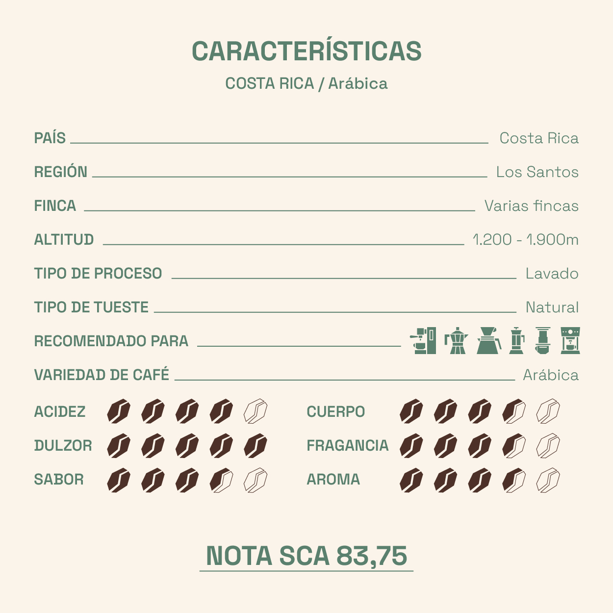 - Café de especialidad costarricense con nota SCA de 83,75 puntos.