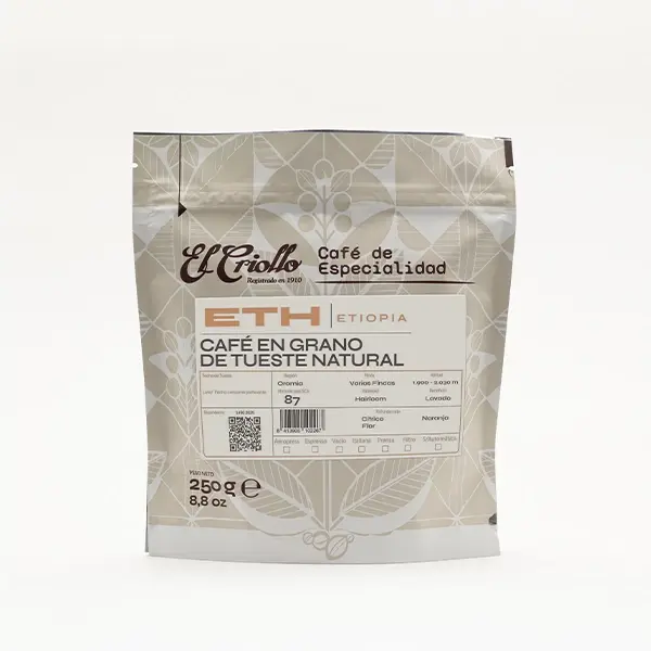Este café de especialidad de Etiopía se obtiene mediante un proceso lavado (washed), ideal para resaltar la pureza de sus notas florales y su acidez cítrica característica.
