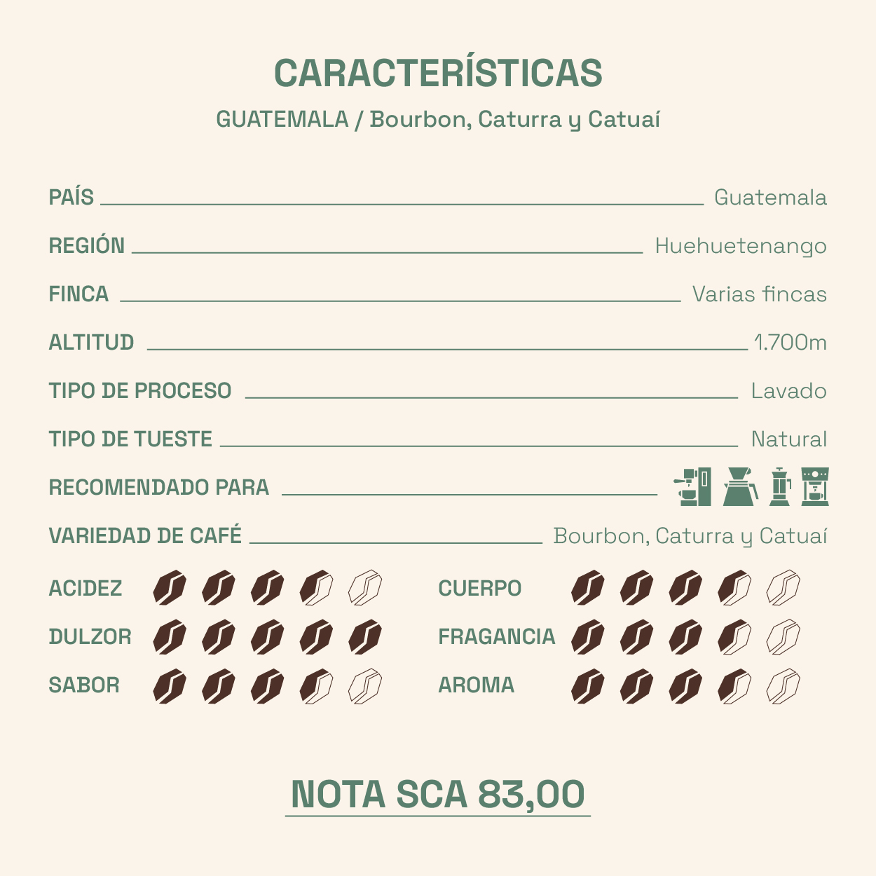 Café de especialidad con un resultado de 83,00 puntos en cata. Este café de Guatemala, presenta una fragancia enzimática frutal muy expresiva, en la que destacan notas limpias y jugosas a grosella, pasas y miel. La base aromática se construye sobre matices tostados de cacao y pan ligeramente horneado, que aportan profundidad y complejidad al conjunto.