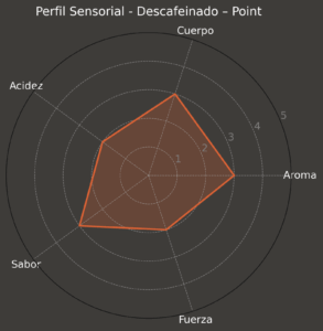 Su perfil ha sido diseñado para quienes desean seguir disfrutando de una taza aromática y agradable en cualquier momento del día, especialmente por la tarde o noche. El resultado es una infusión con buen cuerpo, aroma envolvente y final suave, sin perder la esencia del café.